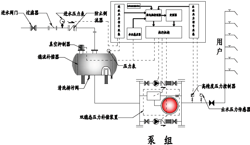 另外如設備原理圖所示,通過微機控制、雙穩(wěn)態(tài)壓力補償裝置及真空補償系統(tǒng),使本設備可以和自來水直接串接,因水泵工作的疊加原理,使設備可以充分利用自來水原有的壓力,增加了變頻調(diào)速給水設備的節(jié)能點。當自來水壓力不足致使壓力下降時,本設備通過真空抑制器及穩(wěn)流補償器中的檢測裝置采集穩(wěn)流補償器內(nèi)的水位信號,通過微機控制真空抑制器及雙穩(wěn)態(tài)壓力補償裝置中的的特殊裝置動作,抑制負壓的產(chǎn)生,保證設備不對城市管網(wǎng)產(chǎn)生任何影響。